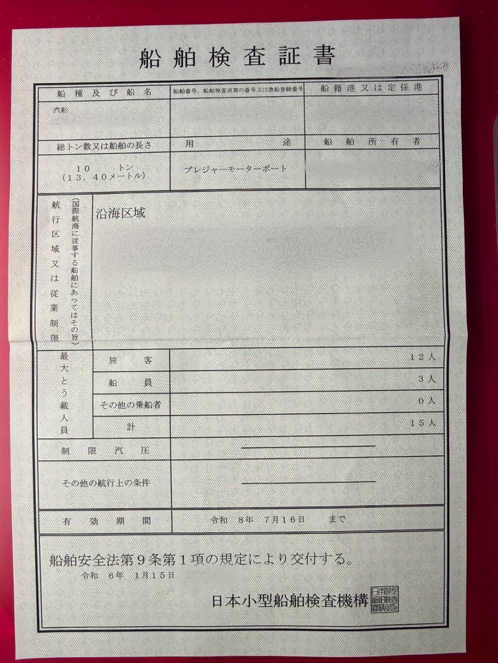 | 登録寸法 | 甲板前部より舵迄の長さ 長さ:13.40m / 幅:3.06m / 深さ:1.29m |