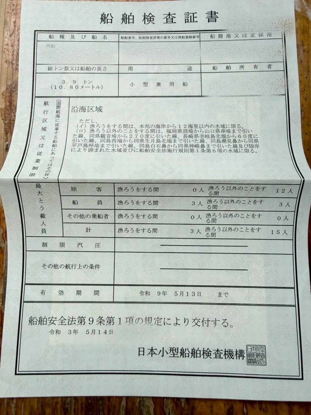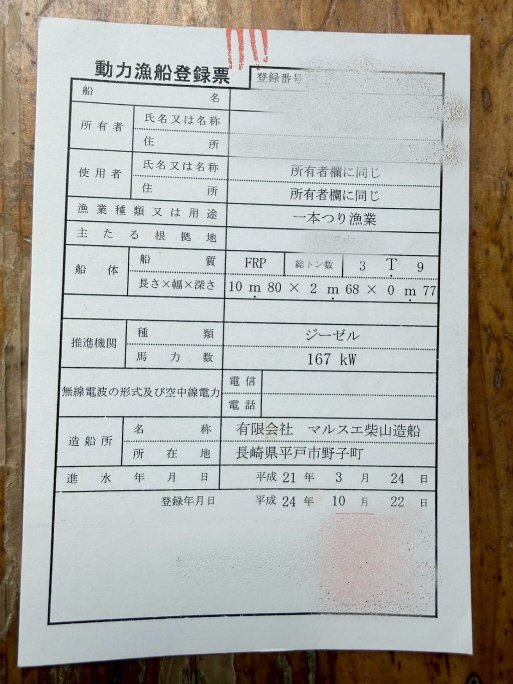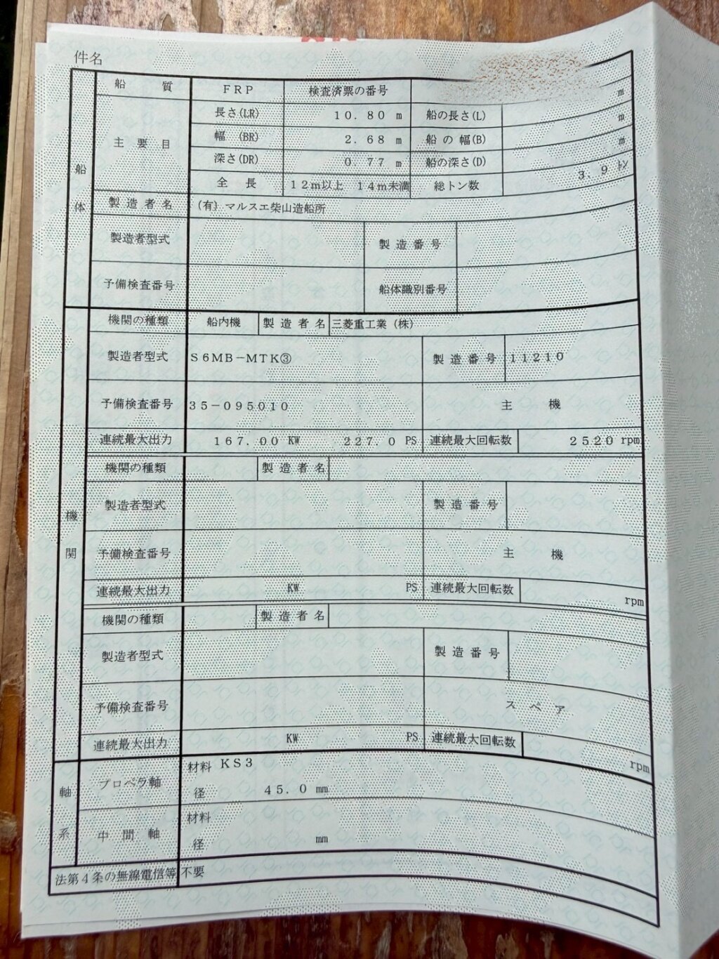 登録寸法 | 甲板前部より舵迄の長さ 長さ:10.80m / 幅:2.68m / 深さ:0.77m |