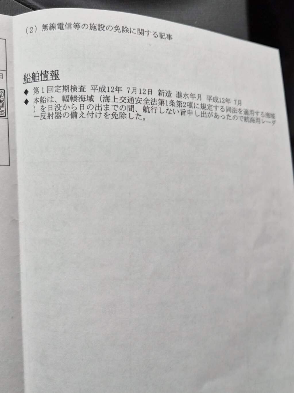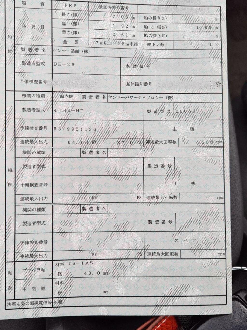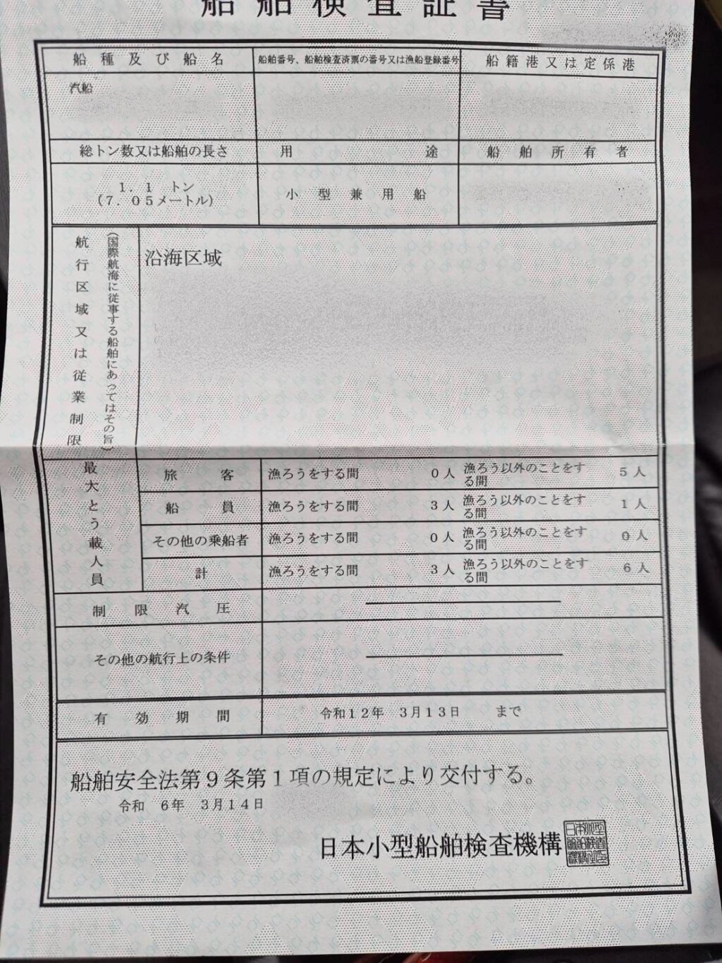 | 登録寸法 | 甲板前部より舵迄の長さ 長さ:7.05m / 幅:1.92m / 深さ:0.61m |
